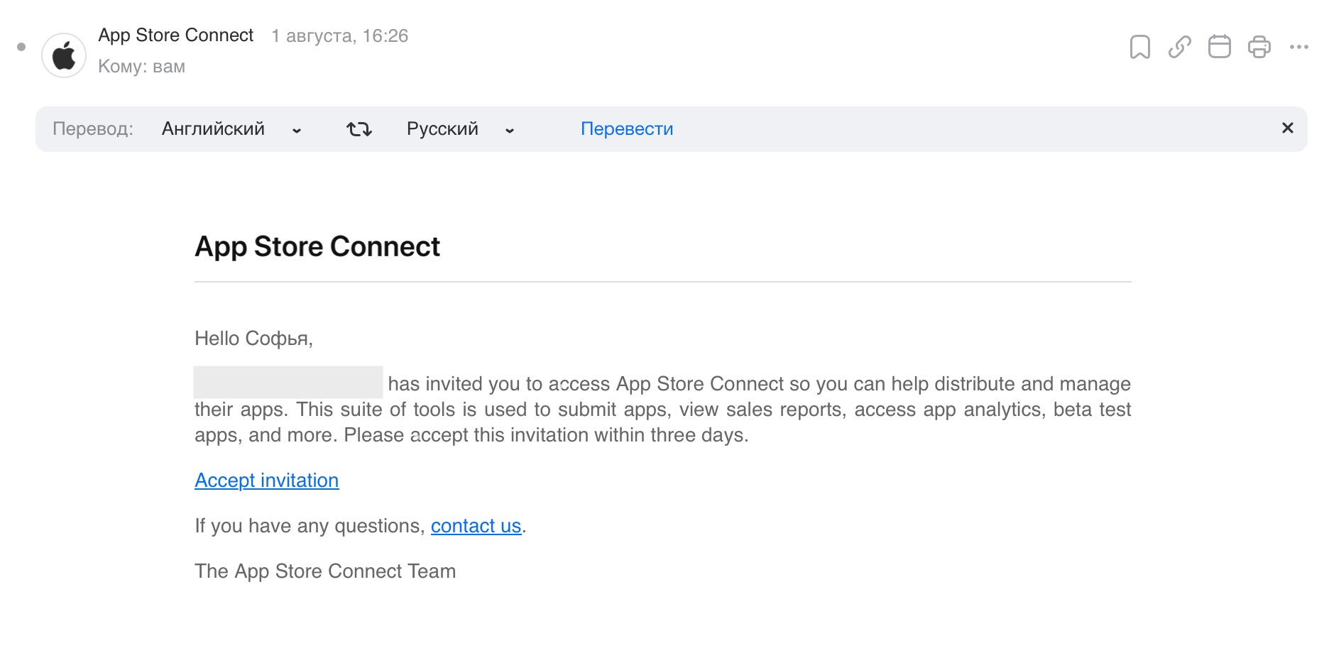 Далее высылается второе приглашение, непосредственно к тестированию конкретного приложения. В письме нужно нажать на кнопку "View in TestFlight" или "Посмотреть в TestFlight". Если приложение не открывается автоматически, скопируйте ссылку из письма и вставьте ее в браузер Safari на вашем устройстве.